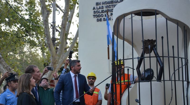 Frente al monumento «Llama Votiva», Paula Albarracín de Sarmiento y Libertador Gral. San Martin, Departamento Capital, el gobernador de San
