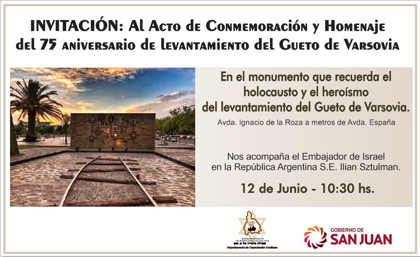 El Martes, 12 de Junio, a las 10:30 hs, en el “Monumento que recuerda el Holocausto y el Levantamiento del Gueto de Varsovia”, Av. Ignacio de la Roza casi esquina Av. España, se desarrolla En el marco del 75º aniversario del Levantamiento del Gueto de Varsovia, la Sociedad Israelita de Beneficencia de San Juan, invita a la comunidad a la “Conmemoración y Homenaje en el año del Heroico Levantamiento del Gueto de Varsovia”, que cuenta con la visita del Embajador de Israel en la República Argentina, S.E. Ilan Sztulman.