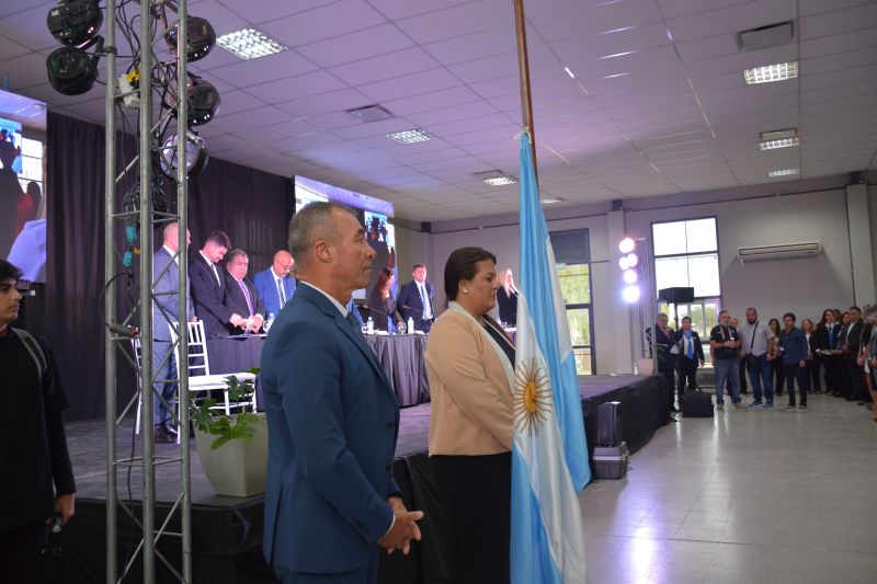 Posteriormente, el Vicegobernador, Dr. Fabián Martín y la Presidente del Concejo Deliberante, Dra. Carolina Correa Corts izaron la Bandera Argentina para luego colocarla a media asta para acompañamiento a los damnificados y reafirma su compromiso y apoyo en esta difícil situación a los habitantes de Bahía Blanca. Se realizó un minuto de silencio.