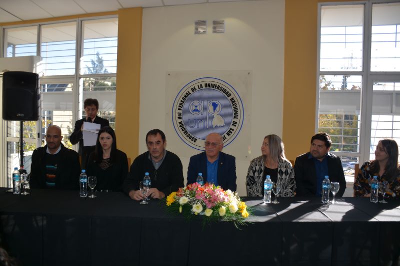Durante el acto, la mesa académica se conformó con el Rector de la UNSJ, Ing. Tadeo Berenguer, el Secretario General de APUNSJ, Daniel Durán; Secretario Gremial, Mauro Castro; Revisora de Cuentas Titulares, Agostina Rocchetti; Secretario de Hacienda y Finanzas, Carlos Contreras; Pro Secretario Gremial, Laura Quiroga, representante de DAMSU, Verónica Reinoso.