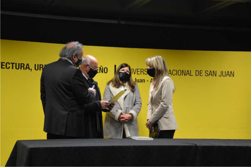 Posteriormente. el Rector de la UNSJ, Mg. Tadeo Berenguer expresó que «felicito al equipo de la FAUD e invito a trabajar en equipo. Estamos fundamentalmente tratando de llevar adelante las promesas que habíamos hecho, sobre todo, ampliar la territorialidad de la Universidad. Hemos tenido reuniones con intendentes, mañana viajamos a Jáchal para abordar las problemáticas que tenemos en (Delegación) Valles Sanjuaninos; también hemos tenido reuniones con intendentes de Calingasta y Valle Fértil. Y en cuanto a temas de la educación a distancia y la pandemia estamos trabajando. Ayer hemos llegado a un consenso y hemos habilitado para los preuniversitarios la presencialidad a través de burbujas, algo tan requerido por la comunidad sanjuanina. Hemos trabajado y articulado con la Provincia”, dijo el Rector.