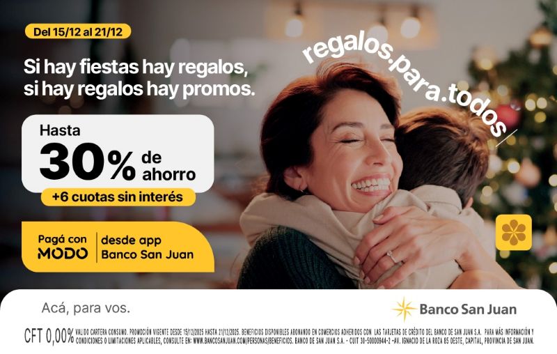 Del 15 al 21 de diciembre inclusive, los usuarios de tarjetas de crédito de Banco San Juan podrán acceder a hasta 30% de ahorro y 6 cuotas sin interés en shoppings, jugueterías, indumentaria, calzado, ropa deportiva, regalaría, marroquinería, perfumerías, joyerías, librerías y comercios adheridos.