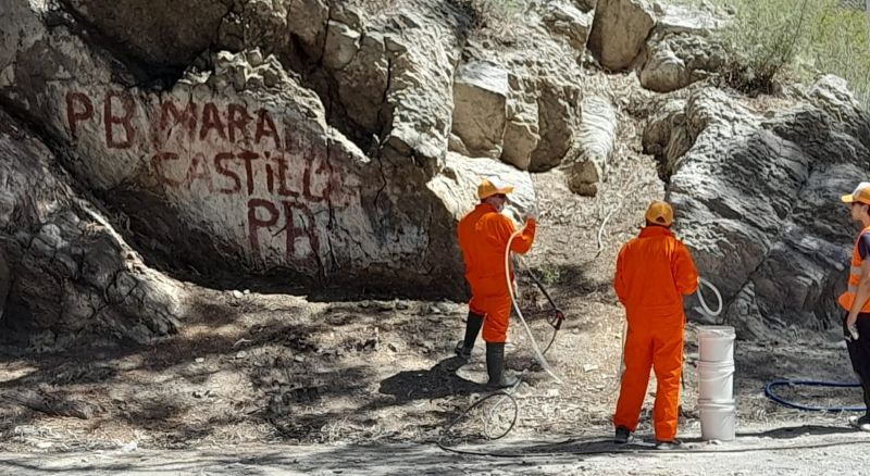 Por esa razón es que el Lunes 13 y el Martes, 14 de Octubre, se realiza la primera etapa de la tarea de arenado de los grafitis en la roca para restaurar la formación geológica Laja en la montaña, con la colaboración voluntaria de la Fundación Pro-Montaña de la Provincia de Mendoza y ONGs de San Juan.