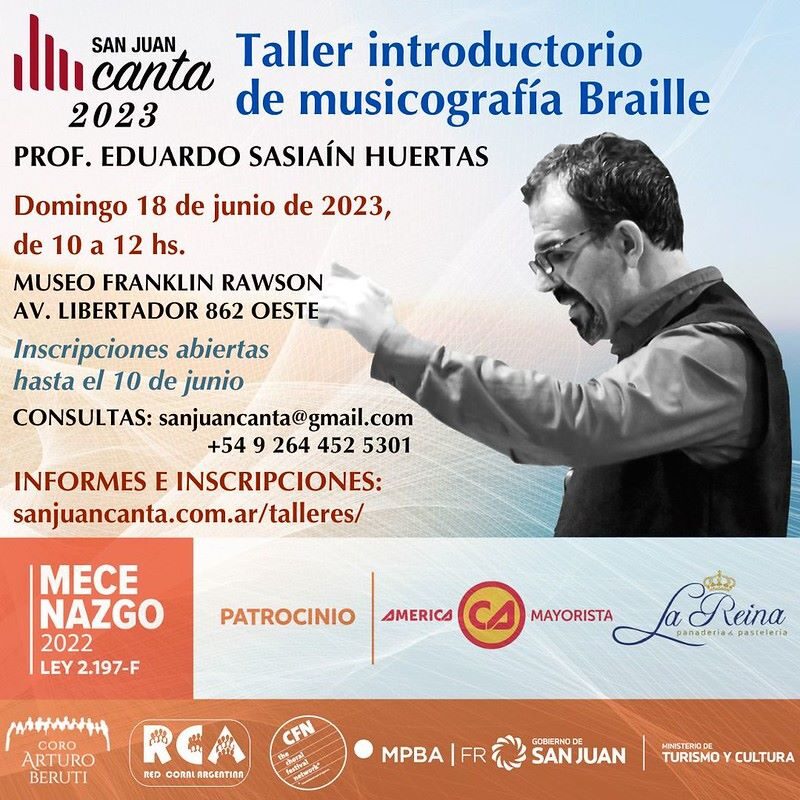 - 18 de junio está previsto el “Taller introductorio de musicografía braille”, dictado por Eduardo Sasiaín Huertas.