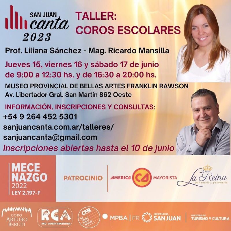- Del 15 al 17 de junio se dictará el “Taller de Coros Escolares”, a cargo de Liliana Sánchez y Ricardo Mansilla.