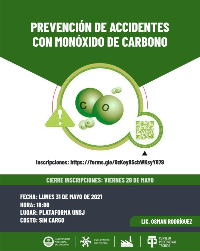 El Lunes, 31 de Mayo, a las 18 hs.; en la plataforma de la UNSJ se desarrolla la charla “Prevención de accidentes con monóxido de Carbono” a cargo del Lic. Osman Rodríguez