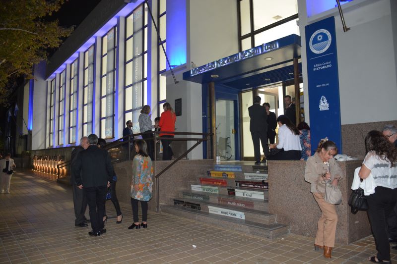 En el Hall del Edificio Central de la Universidad Nacional de San Juan, el Rector Ing. Tadeo Berenguer y la Vicedecana Dra. Analía Ponce dio la bienvenida a los invitados que se sumaron a los festejos de inicio de las celebraciones por los 50 años de vida de la Alta Casa de Estudios.