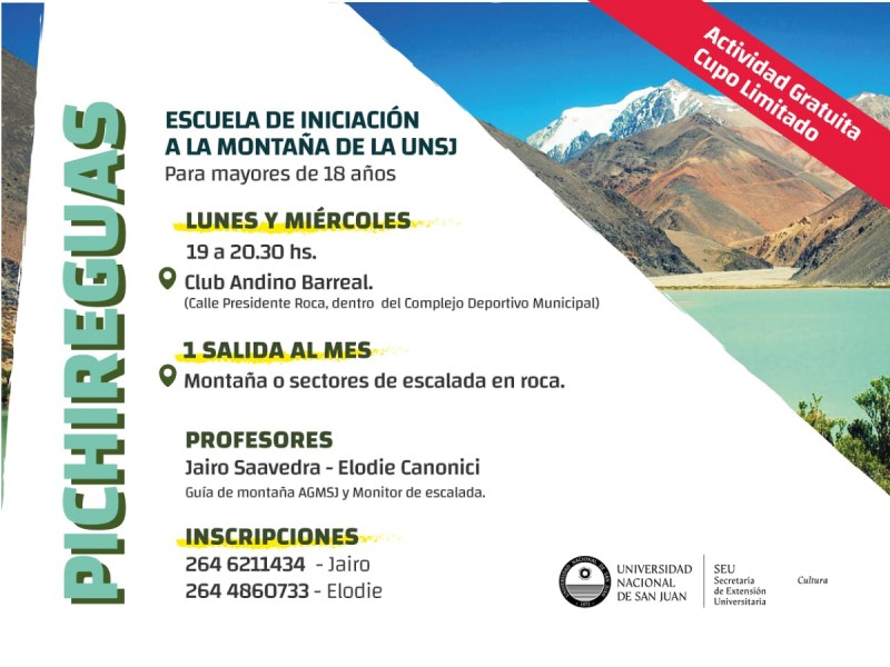 «La idea es que los jóvenes de esa localidad no deban luego emigrar en busca de trabajo”, señaló a su vez DI Eliana Perniche, secretaria de Extensión Universitaria de la UNSJ, sobre esta actividad gratuita que se desarrollará todos los lunes y miércoles de 19 a 20.30 en el Club Andino Barreal. El profesor Jairo Saavedra y la profesora Elodie Canonici se encargarán del curso para jóvenes barrealinos. El Proyecto, que lleva el nombre de “Pichireguas”, por la localidad de las altas montañas, “busca que luego los chicos puedan trabajar como guías de montaña o que puedan organizar grupos de trekking. En el curso van a obtener nociones básicas que tienen que ver con el desenvolvimiento en el entorno natural, en el campo, en la montaña y sobre escaladas, trekking y rapel, utilización de cuerdas para ascenso y descenso. Las prácticas serán en precordillera y en el Club Andino Barreal”, explicó González.
