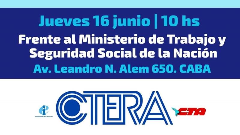 El Jueves, 16 de Junio, a las 10 hs.; frente al Ministerio de Trabajo y Seguridad Social de la Nación, Avda. Leandro N. Alem 650 – CABA, CTERA convoca a los Docentes Jubilados a la concentración y acto en defensa de la jubilación Docente Nacional y por la Trimestralización de la Movilidad Jubilatoria Docente.