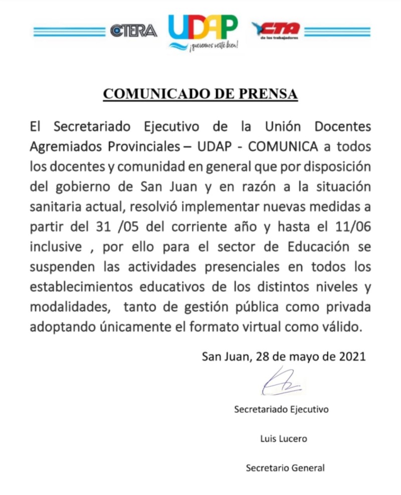 UDAP informa que por disposición del Gobierno de San Juan y por razones de la situación sanitaria resolvió suspender las actividades presenciales en todos las escuelas hasta el 11 de Junio en todos los niveles y modalidades tanto de gestión estatal como privada manteniéndose la educación virtual.