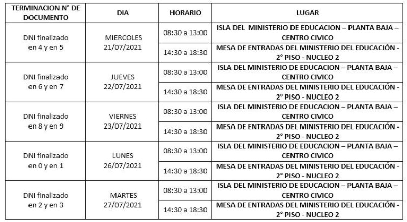 El personal de Servicios Generales (porteros) debe presentar al director del establecimiento educativo donde se desempeña la Factura Electrónica correspondiente al mes de julio 2021. Luego el equipo directivo o responsable designado para esta tarea debe entregarlas en el Centro Cívico según el siguiente cronograma: