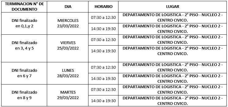 El Ministerio de Educación del Gobierno de San Juan informa que las personas que poseen contratos administrativos de Servicios de Colaboración deben concurrir a su establecimiento educativo para presentar al directivo la factura electrónica correspondiente a marzo 2022. Posteriormente, el directivo o responsable designado para esta tarea la entregará en la Oficina de Logística, ubicada en el Centro Cívico, de acuerdo al siguiente cronograma: