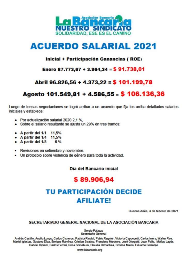 Luego de arduas negociaciones, las partes acordaron revisiones salariales en septiembre y noviembre y un salario inicial, que incluye participación en las ganancias, de casi 92 mil pesos en enero, de 101 mil en abril y de 106 mil en agosto, detallaron a Télam el titular de la Bancaria Sergio Palazzo y el secretario de Prensa Eduardo Berrozpe.