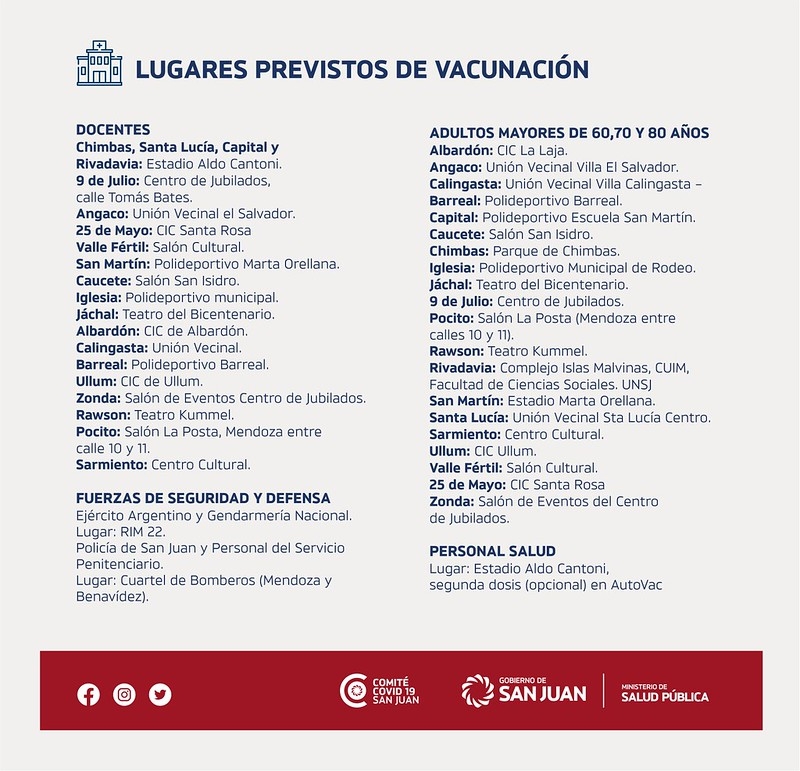 La provincia de San Juan cuenta hoy con los siguientes Centros de vacunación distribuidos en toda la provincia.