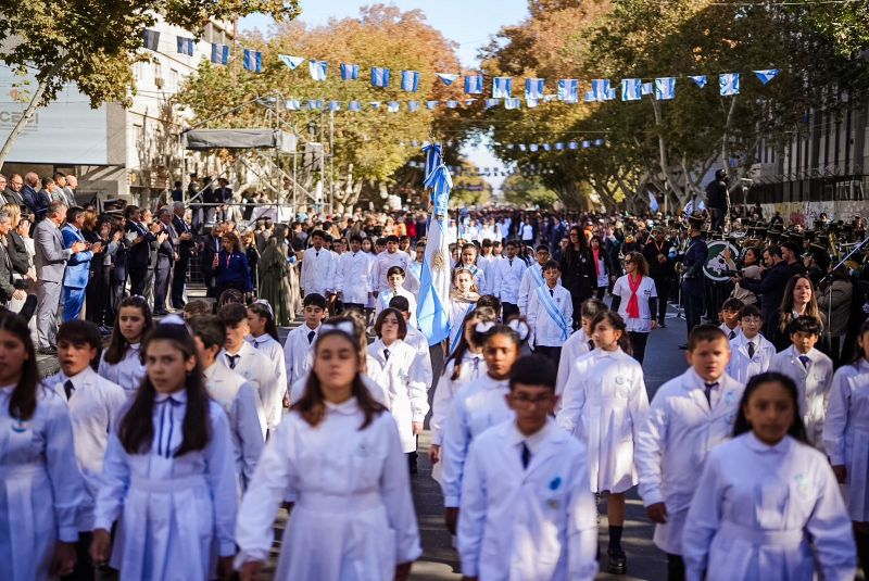 El desfile Cívico Militar para conmemorar 215 años de la Revolución de Mayo se desarrolló en el centro de la Ciudad de San Juan, participaron unas 5.000 personas, más de 50 escuelas, cerca de 2.500 estudiantes y docentes de la provincia, tanto de gestión pública como privada, de los diferentes niveles y modalidades.
