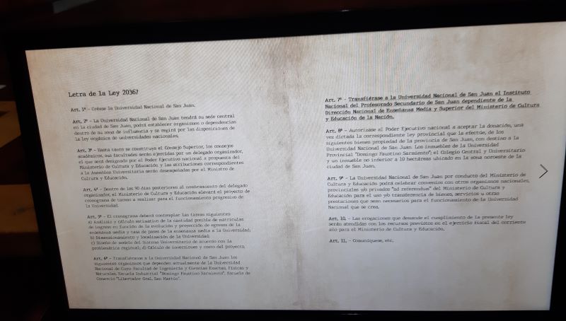 Al leer la historia de la FFHA se inició el 28 de junio de 1973, en el despacho de la Subsecretaria de Educación de la Nación, Dra. María Arsenia Tula, se firmó el Acta fundacional de la UNSJ. Por este instrumento legal se puso en “posesión del cargo” de Delegado Organizador al Ing. Julio Rodolfo Millán y en el mismo acto se dispuso que el Instituto Nacional del Profesorado Secundario Domingo Faustino Sarmiento pase a depender de la UNSJ. Esta situación significó que el Instituto fue el Primer Organismo que se incorpora a la UNSJ.