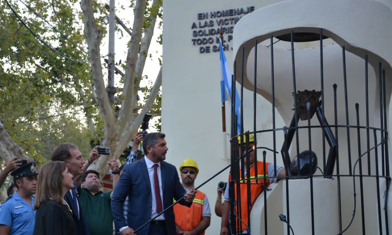 Frente al monumento «Llama Votiva», Paula Albarracín de Sarmiento y Libertador Gral. San Martin, Departamento Capital, el gobernador de San Juan, Dr. Marcelo Orrego junto ministro del Interior, CPN Diego Santilli y entre otrsos participantes presidieron la Emotiva memoria a las víctimas del Terremoto 1944 en San Juan en su 82° años que se cumple el 15 de Enero.
