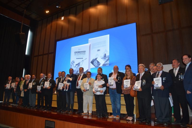 A continuación, fue llevada a cabo la entrega de ejemplares a los veteranos de guerra. En primer lugar, recibió Mabel del Carmen Tejada y Renzo Perea, esposa e hijo del ex combatiente quien fuera jefe de mayordomía de la Cámara de Diputados, Hugo Perea.