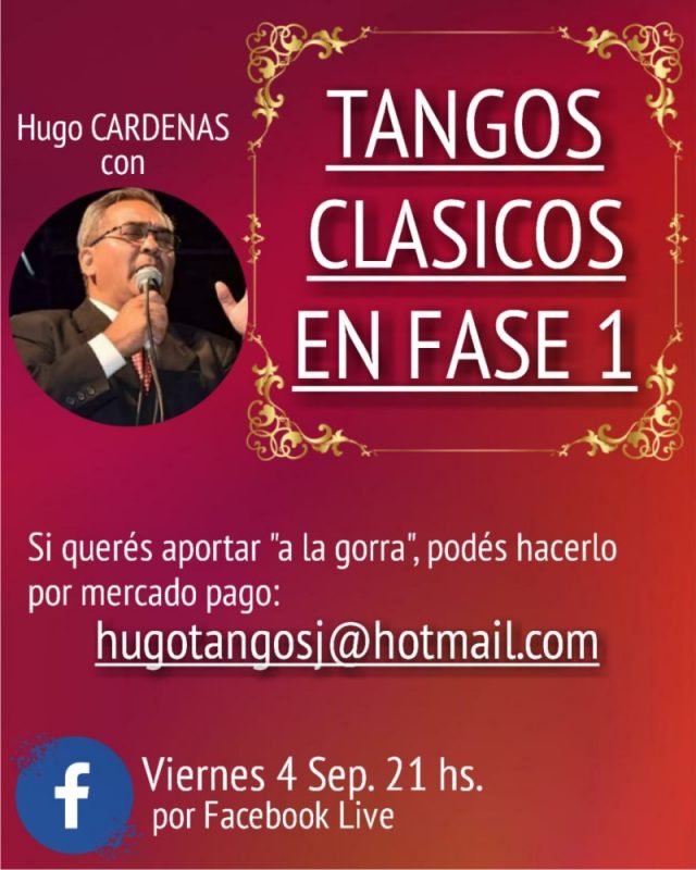 Cartelera Hugo Cárdena en «Tangos Clásicos en Fase 1» San Juan, 3 de septiembre de 2020 Analia Neira Compartir en tus redesEl Viernes, 4 de Septiembre, a las 21 hs.; disfruta «Tangos Clásicos en Fase 1» con la voz de Hugo Cárdena por vía Facebook Live.