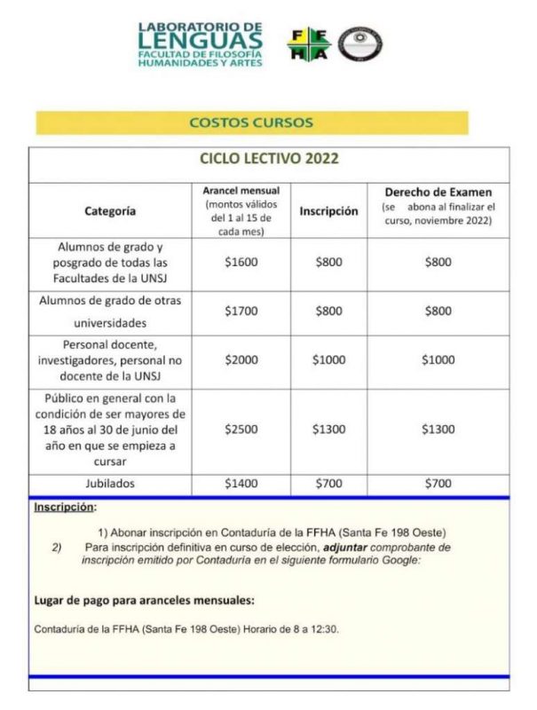 El pago de inscripción y aranceles se realiza de forma presencial y en efectivo en Contaduría de la FFHA de la UNSJ, esquina sureste de Sarmiento y Santa Fe, de 8 a 12:30 hs.