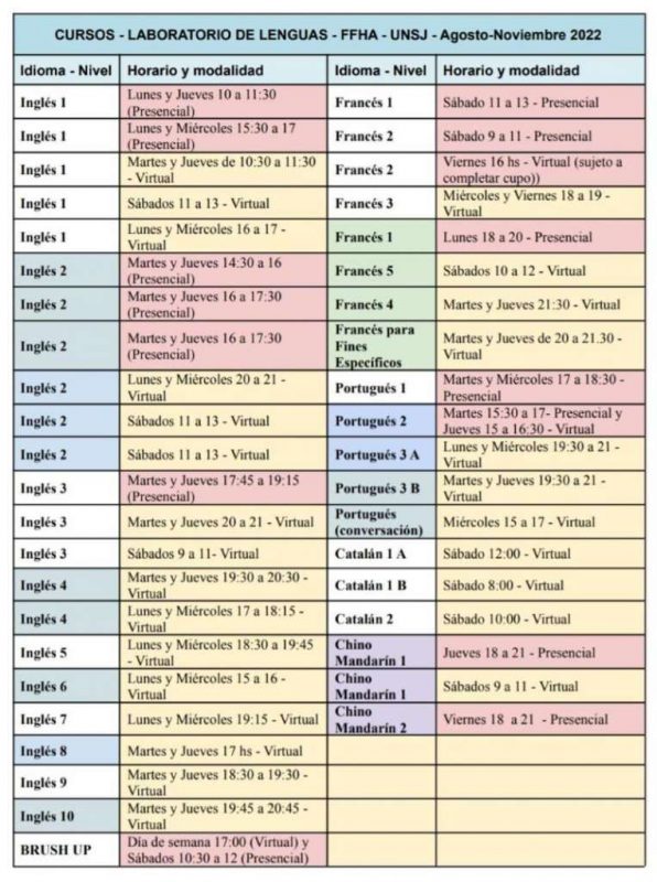La Facultad de Filosofía, Humanidades y Artes de la Universidad Nacional de San Juan informa que están abiertas las inscripciones a los cursos de idiomas periodo Agosto-Noviembre de 2022.