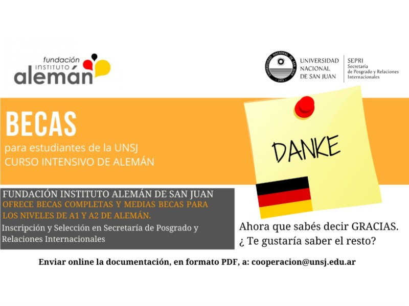 La Secretaría de Posgrado y Relaciones Internacionales de la Universidad Nacional de San Juan abre el plazo de inscripción, online, para las becas de idiomas Alemán, Nivel A1 y A2 ofertadas en colaboración con la Fundación Instituto Alemán –Goethe Zentrum San Juan.