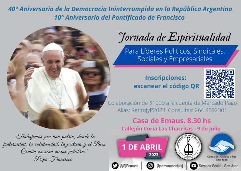 Con la inspiración de las palabras del Papa Francisco que nos dice «Trabajemos por una patria, donde la fraternidad, la solidaridad, la justicia y el Bien Común no sean meras palabras», el Arzobispado de San Juan de Cuyo y la Comisión Arquidiocesana de Justicia y Paz organizan esta jornada que contará con la iluminación del Padre Pepe Di Paola en el marco del 40° aniversario de la Democracia ininterrumpida en la República Argentina y el 10° Aniversario del Pontificado del Papa Francisco.