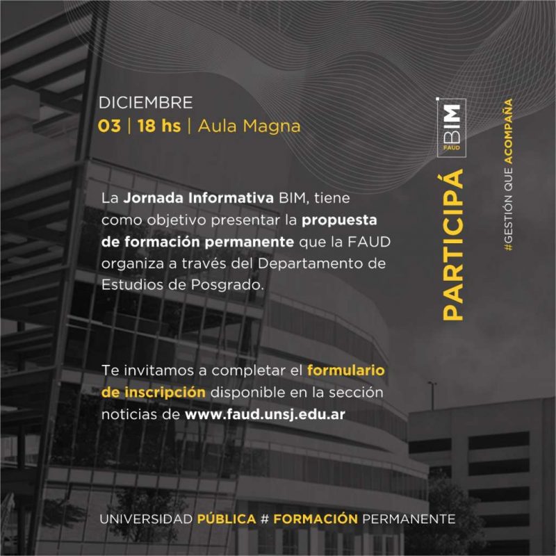 El Viernes, 3 de Diciembre, a las 18 hs.; en el Aula Magna de la Facultad de Arquitectura, Urbanismo y Diseño de la Universidad Nacional de San Juan se desarrolla la Jornada Informativa BIM. Es presencial y gratuita.