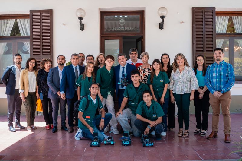 Los alumnos de 5° año de la Escuela Agrotécnica de Zonda, Departamento Zonda, Provincia de San Juan creadores de robots con sensores, para medir la humedad del suelo y un simulador de manejo de tractor, fueron recibidos en Casa de Gobierno por el gobernador de San Juan, Dr. Marcelo Orrego, la ministra de Educación, Lic. Silvia Fuentes y la secretaria de Educación, Lic. Mariela Lueje.