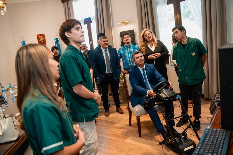 Durante la visita, el Gobernador Dr. Marcelo Orrego no sólo observó cómo funcionan los robots, sino que se animó a probar el simulador de manejo, mientras los jóvenes le explicaron cómo lo desarrollaron.