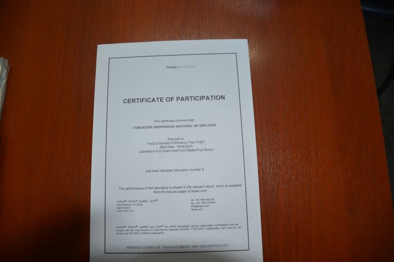 Recientemente, el LAPRIQ ha participado en un ensayo interlaboratorio internacional coordinado por FAPAS – Food Analysis Performance Assessment Scheme -, North Yorkshire, Inglaterra, obteniendo el mejor resultado de todos los laboratorios participantes, en la medición de Ocratoxina A en pasas de uva. Cabe destacar que este el único laboratorio de la Provincia acreditado específicamente para determinar ocratoxina en pasa de uva.