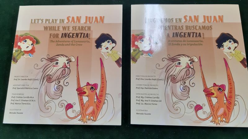 El libro «Jugamos en San Juan mientras buscamos a Ingentia: aventuras de Lunasauria, el Zonda y su tripulación» es un producto de un Proyecto bajo los investigadores de la FFHA de la UNSJ, la FAUD de la UNSJ y la colaboración del conocimiento científico de la FCEFN de la UNSJ.