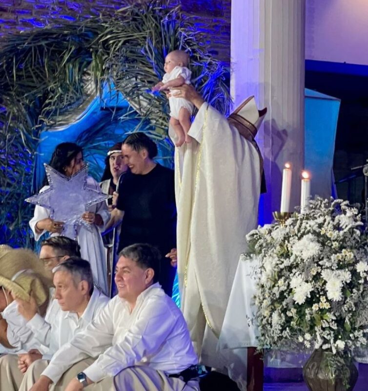 Finalmente, Arzobispo de San Juan de Cuyo Monseñor Jorge Eduardo Lozano levantó al actor principal, el bebé que representó el Niño Jesús, que participó de la recreación del pesebre y el inicio de la Sagrada familia producto del gran amor.