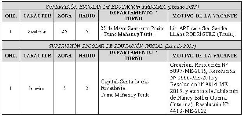 La Junta de Clasificación Docente Rama Primaria convoca a cubrir un cargo vacante de Supervisión Escolar de Educación Primaria –Zona 25 (suplente), y otro de Supervisión Escolar de Nivel Inicial –Zona 5 (interino), conforme a lo dispuesto por las Resoluciones Nº 2404-ME-2022, Nº 3205-ME-2022 y Nº 4228-ME-2022, ajustándose al siguiente cronograma: