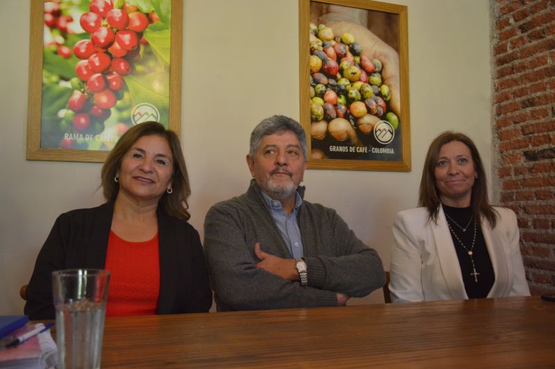 En Conferencia de Prensa de los Secretarios Generales de UDAP, Lic. Patricia Quiroga, el de AMET, Prof. Daniel Quiroga y de UDA, Prof. Karina Navarro, en una confitería céntrica de San Juan.
