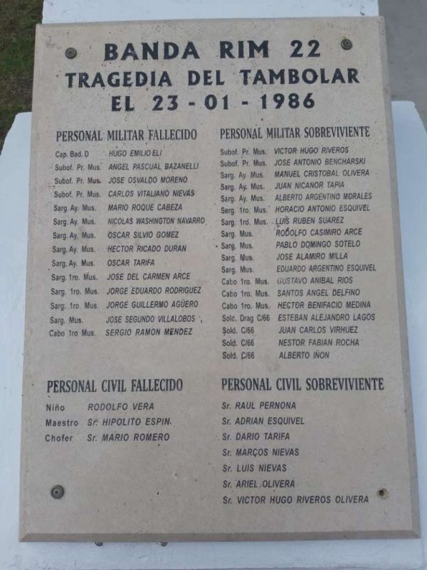 Lo que llamó la atención la presencia de una placa recordatoria de la Banda de Música del RIM 22, que sufrió un accidente de tránsito en el Tambolar, el 23 de Enero de 1986, cuyos integrantes en su mayoría falleció, otros sobrevivieron entre militares y civiles.