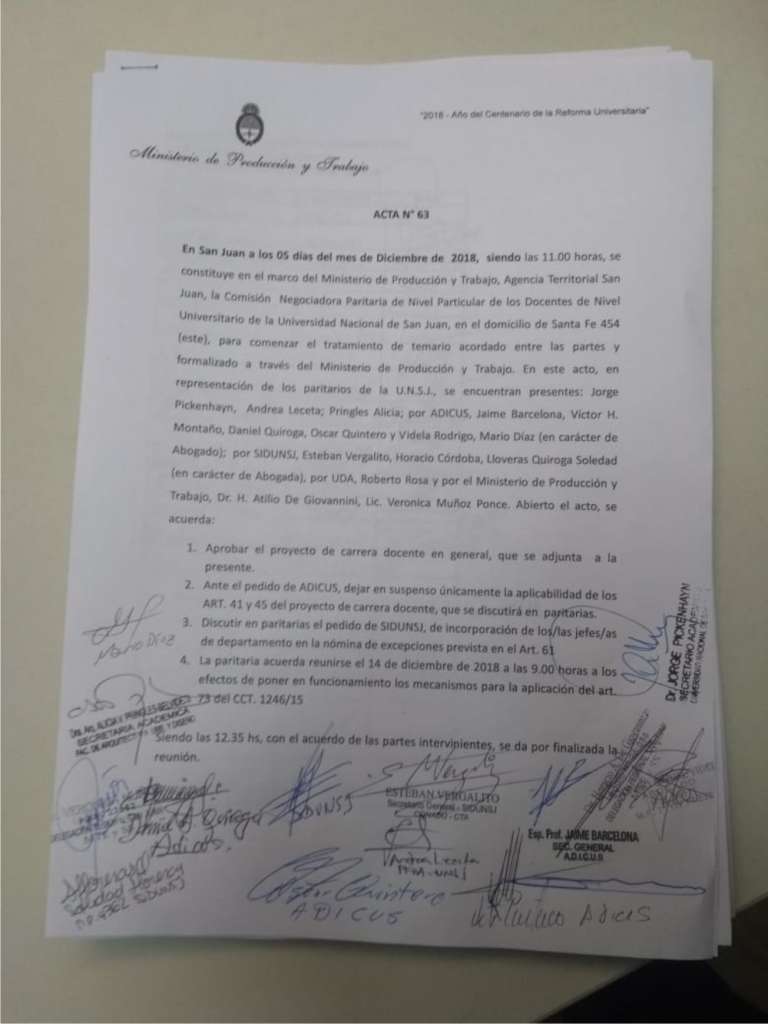 La Asociación de Docentes, Investigadores y Creadores de la Universidad Nacional de San Juan – ADICUS – informa a la comunidad universitaria que, en dependencias del Ministerio de Producción y Trabajo, Agencia Territorial San Juan, la Comisión Negociadora Paritaria de Nivel Particular de los docentes universitarios pertenecientes a la Universidad Nacional de San Juan acordó la aprobación del proyecto de carrera docente en general.