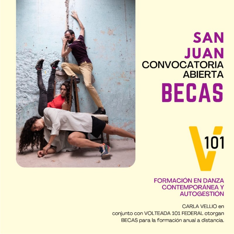 Se trata de la carrera de formación en danza contemporánea y autogestión impulsada por Volteada 101, representada en la provincia de San Juan por la gestora, directora y docente Carla Vellio. Se otorgan 6 becas para bailarines locales.
