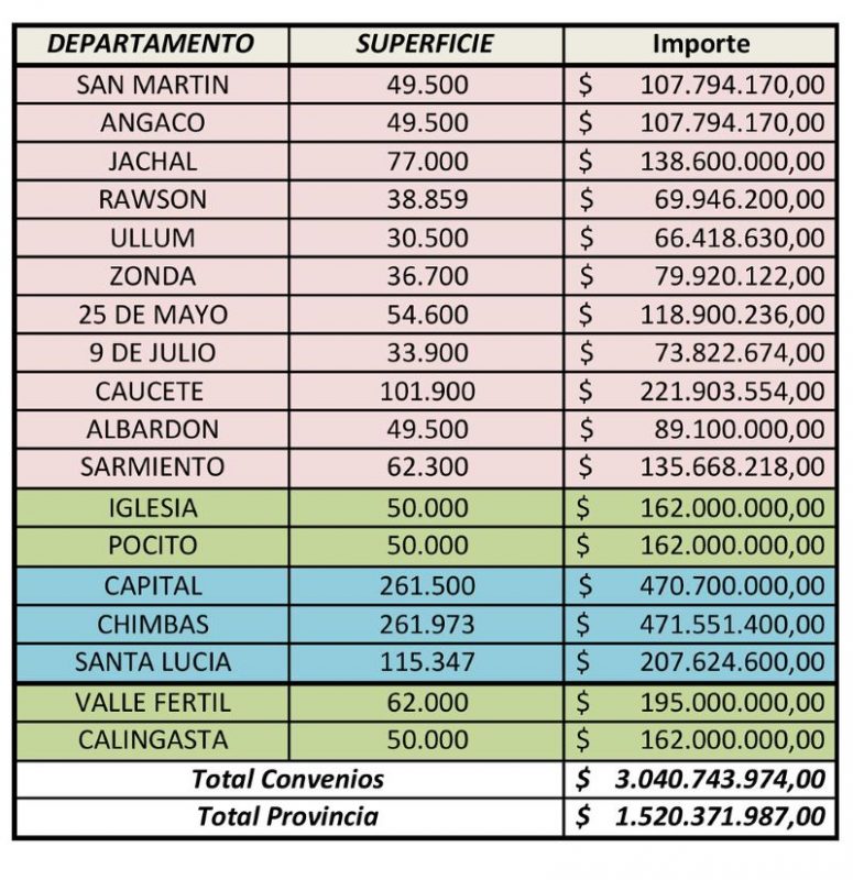 Detalle de los montos destinados a cada departamento para las obras de pavimentación