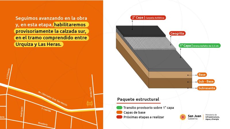 La Avenida Libertador Gral. San Martín, cuenta con un tramo habilitado de manera provisoria a partir del Lunes 31 de Marzo de 2025, luego que, la Dirección Provincial de Vialidad del Gobierno de San Juan completa la colocación de la primera capa de arena asfalto.