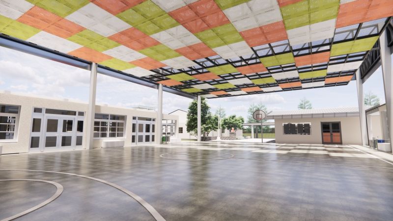 - Techado del patio cívico: se construirá una cubierta con chapas perforadas de colores, sostenida por una estructura mixta de hormigón armado y metálica, lo que permitirá utilizar el espacio como área de actividades físicas y recreativas.