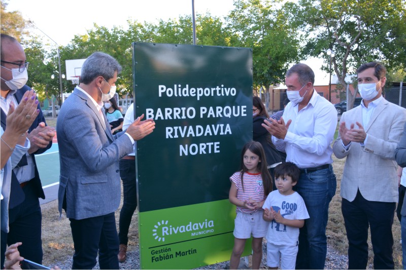 El acto comenzó con el corte de cinta a la entrada del Polideportivo del Barrio Parque Rivadavia Norte, donde el Intendente de la Municipalidad de Rivadavia, Dr. Fabián Martin y el Gobernador de San Juan, Dr. Sergio Uñac junto a otras autoridades y vecinos realizaron el corte e ingresar para luego, descubrir el cartel que contiene el nombre del espacio deportivo.
