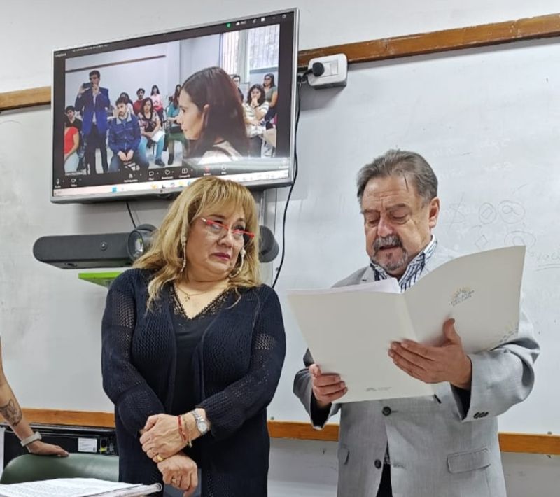 Es así que el Legislador de la Cámara de Diputados de San Juan, Dr. Mario Herrero entregó la Resolución de la Declaración de la Institución por el Ciclo “Irán, Estados Unidos e Israel: antecedentes históricos y tensiones actuales en Medio Oriente” a la Dra. Cristian Espejo.