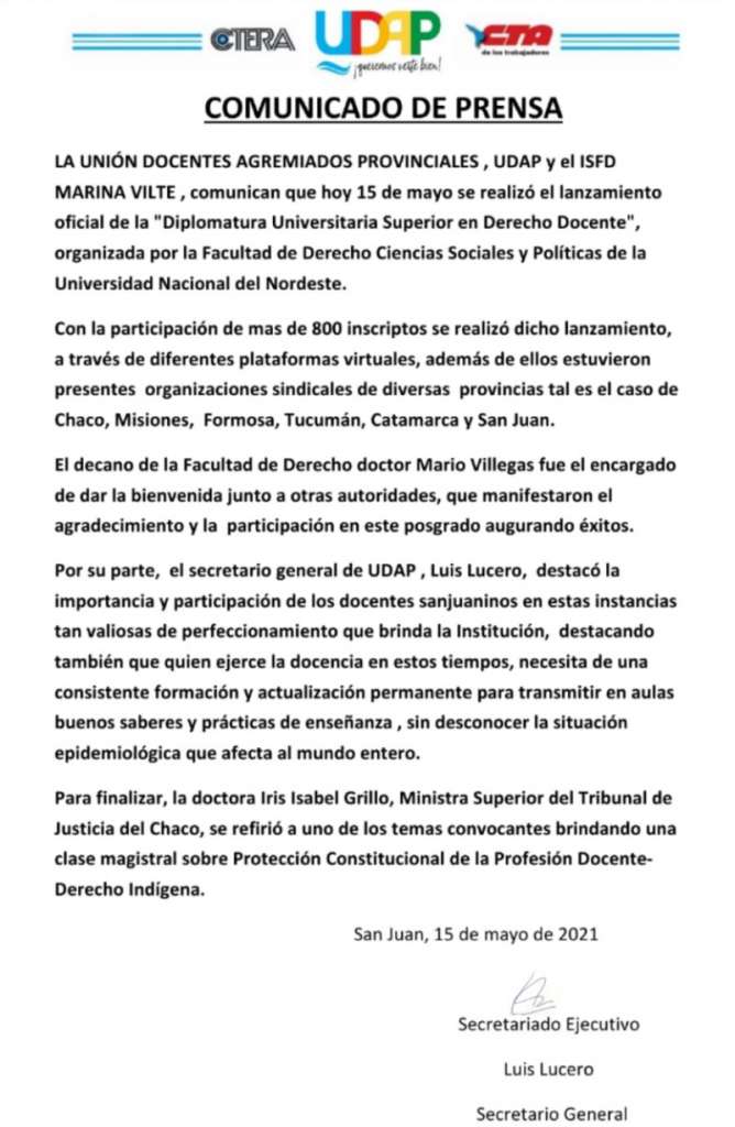 Cursos Se lanzó la «Diplomatura Universitaria Superior en Derecho Docente» San Juan, 15 de mayo de 2021 Analia Neira Compartir en tus redesUDAP informa que el Sábado, 15 de Mayo, se lanzó la «Diplomatura Universitaria Superior en Derecho Docente» organizada por la Facultad de Derecho Ciencias Sociales y Políticas de la Universidad Nacional de Nordeste.