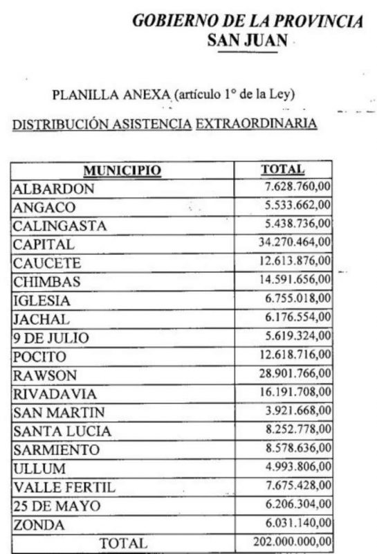 Subsidio por 202 millones a los 19 departamentos de San Juan