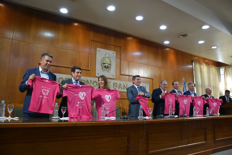 En la Casa de Gobierno de San Juan, se realizó la presentación de la XIII Caminata de Concientización sobre el Cáncer de Mama “Crear Conciencia es la Meta”, organizada por la Fundación Sanatorio Argentino junto al Ministerio de Turismo, Cultura y Deporte, el Ministerio de Salud del Gobierno de San Juan y la Municipalidad de la Ciudad de San Juan y se desarrolla el Sábado, 18 de Octubre, a las 11 s.; frente al Estadio Dr. Aldo Cantoni.