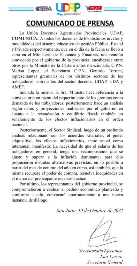 Destacadas UDAP solicita un aumento salarial ajustada a la inflación dominante San Juan, 19 de octubre de 2021 Analia Neira Compartir en tus redes UDAP informa que ha solicitado un aumento salarial ajustada a la inflación dominante a la Ministro de Hacienda y Finanzas del Gobierno de San Juan.