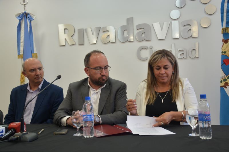 Luego, el Intendente de la Municipalidad de la Ciudad de Rivadavia, Sergio Miodowsky y la Directora de Defensa al Consumidor, María Fabiana Carrizo fueron los responsables físicos de refrendar el convenio de cooperación para la apertura de la Oficina del Consumidor en el Departamento Rivadavia.