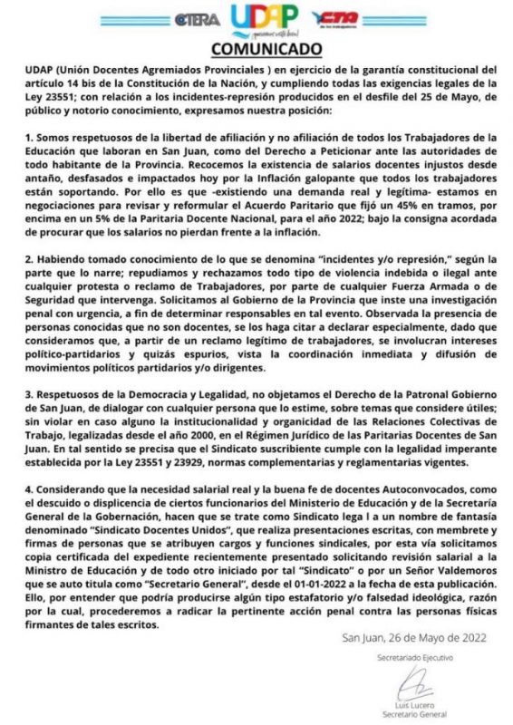Posteriormente, el Gremio UDAP emitió un comunicado
