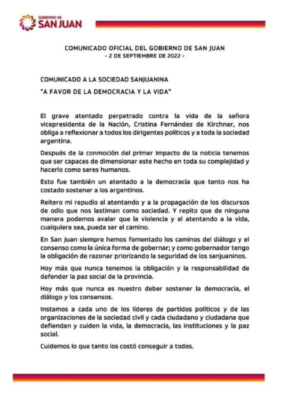 Durante la mañana del Viernes, 02 de Septiembre, el gobernador de San Juan, Dr. Sergio Uñac desarrolló una reunión de Gabinete en virtud de resguardar la paz social y la baja conflictividad, tras el atentado que sufrió la vicepresidenta Cristina Fernández, en la puerta de su casa en la noche del jueves.